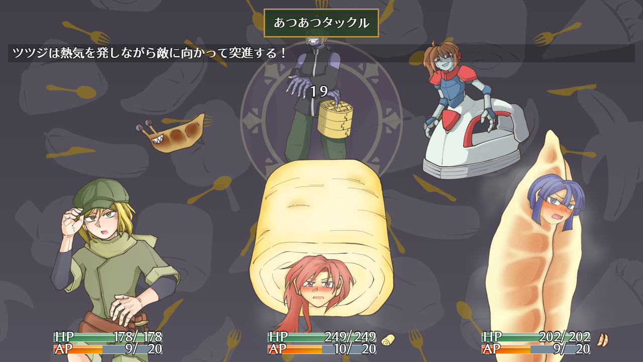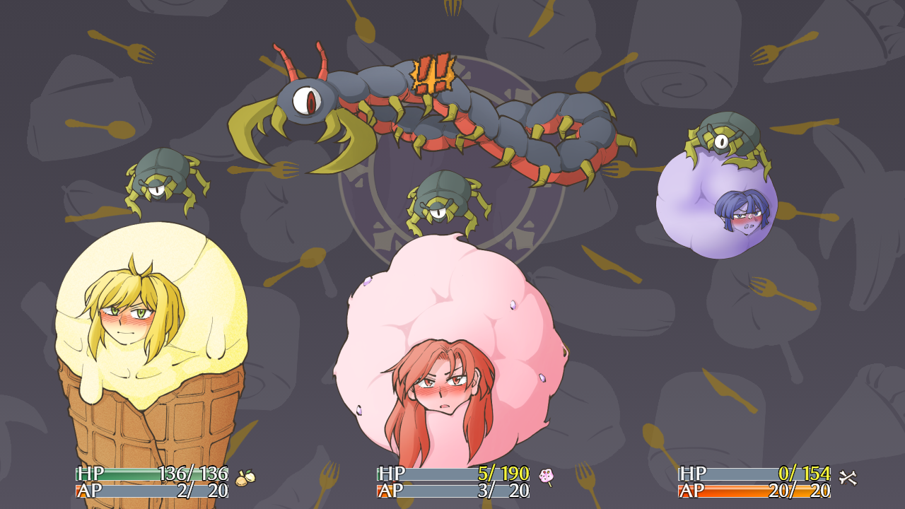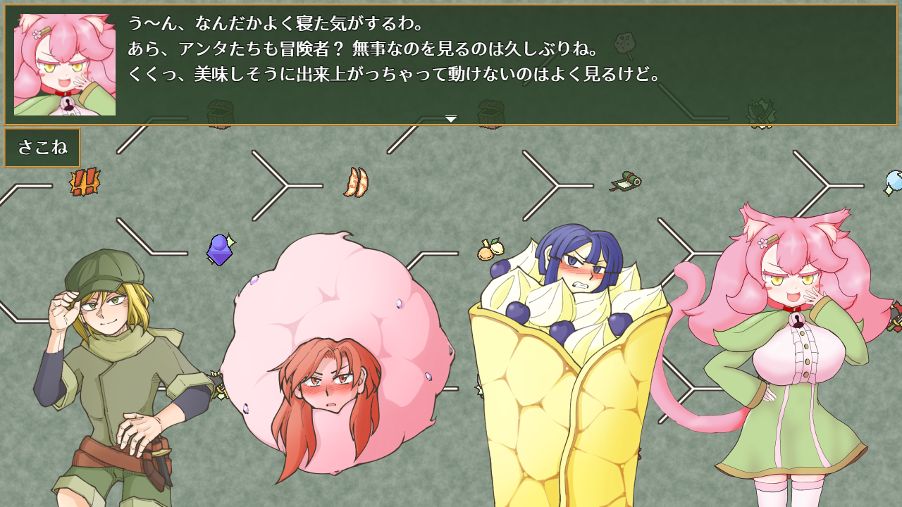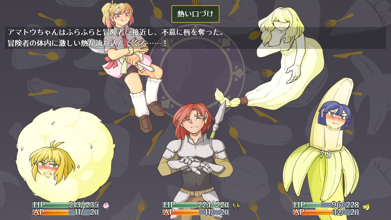 3人の女冒険者たちが食べ物の姿に変えられ、時には食べ物の肉体の力を借りて